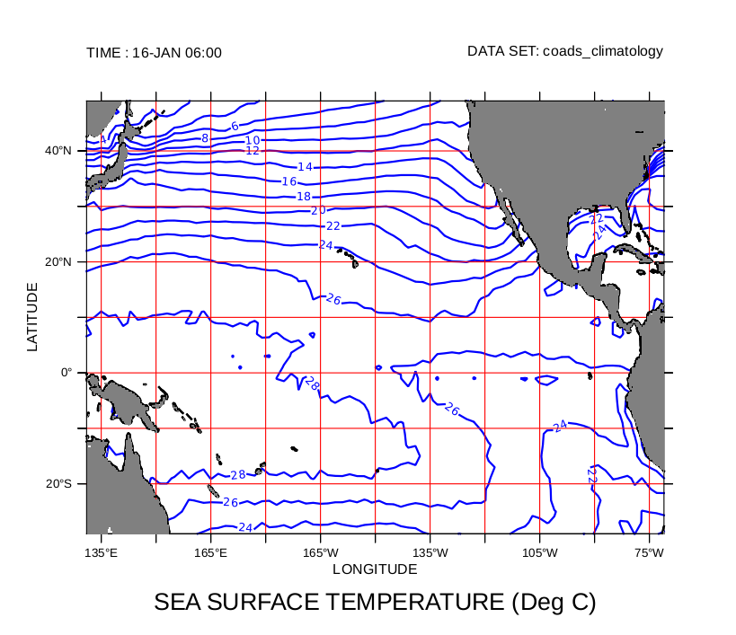 yes? USE coads_climatologyyes? SET REGION/X=130E:70W/y=30S:50N/L=1yes? CONTOUR/COLOR=blue/GRAT=(line,COLOR=red) sstyes? GO land thick yes? GO fland