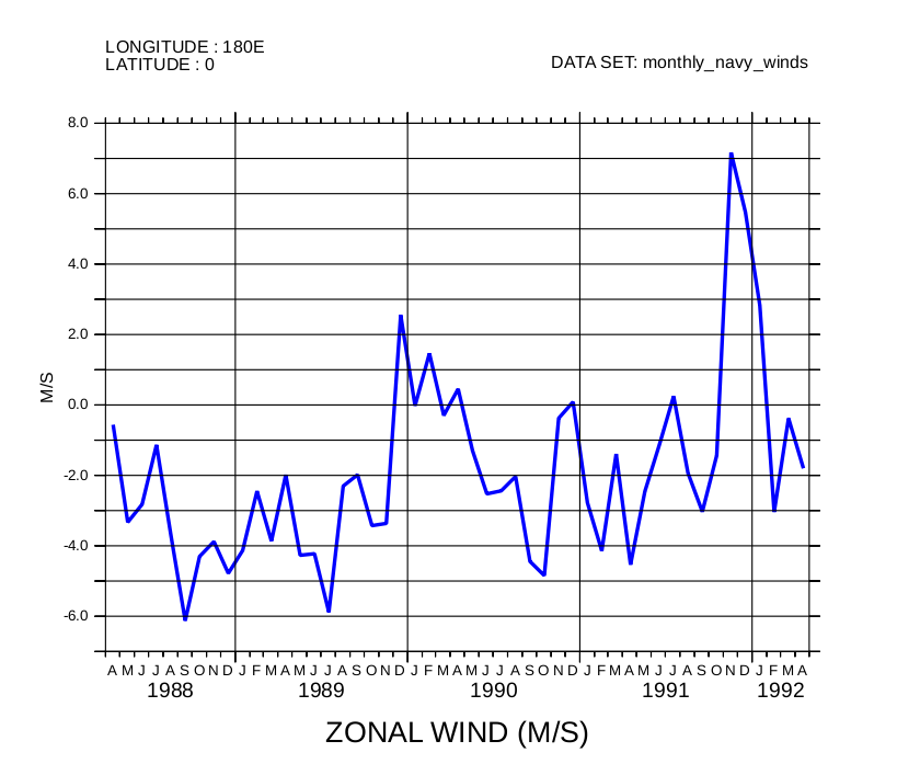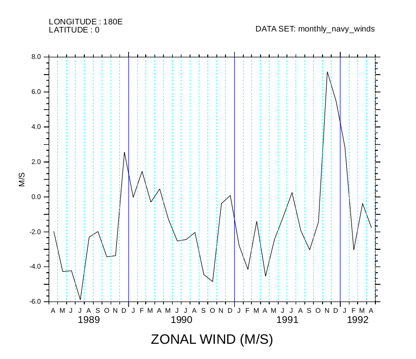 yes? USE monthly_navy_winds yes? PPL AXNMTC 2,2 yes? PLOT/VGRAT="LARGE(line,COLOR=blue),SMALL(dash,COLOR=lightblue)" uwnd[X=180,Y=0,T=1-may-1989:1-may-1992]