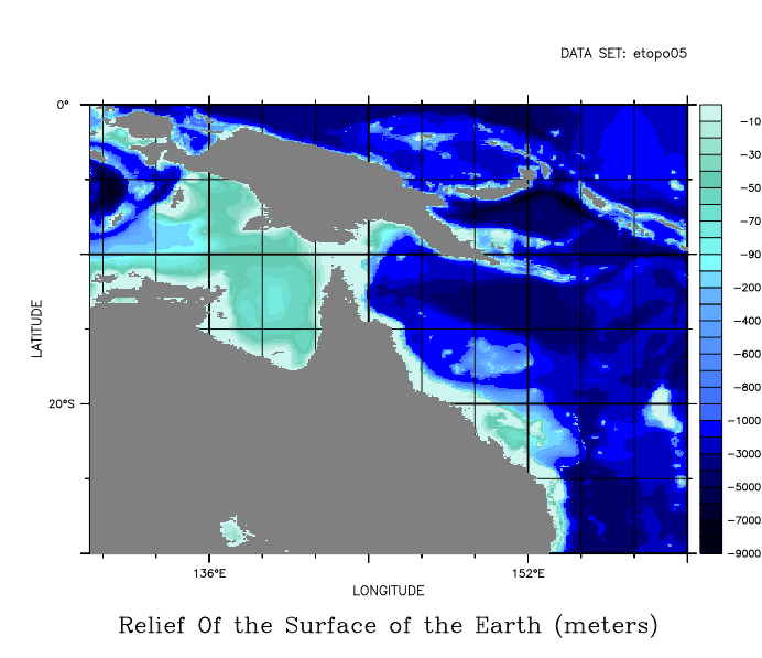yes? PPL AXNMTC 2,1 yes? USE etopo05 yes? SET REGION/X=130E:160E/y=30S:0S yes? SHADE/SET/HGRAT="LARGE=(THICK),SMALL"/VGRAT="LARGE=(THICK),SMALL"\ yes? /PALETTE=topo/LEV=(-9000,-1000,1000)(-1000,-100,100)(-100,0,10) rose yes? PPL XAXIS 130,160,8 yes? PPL YAXIS -30,0,10 yes? PPL SHADE yes? GO fland 5