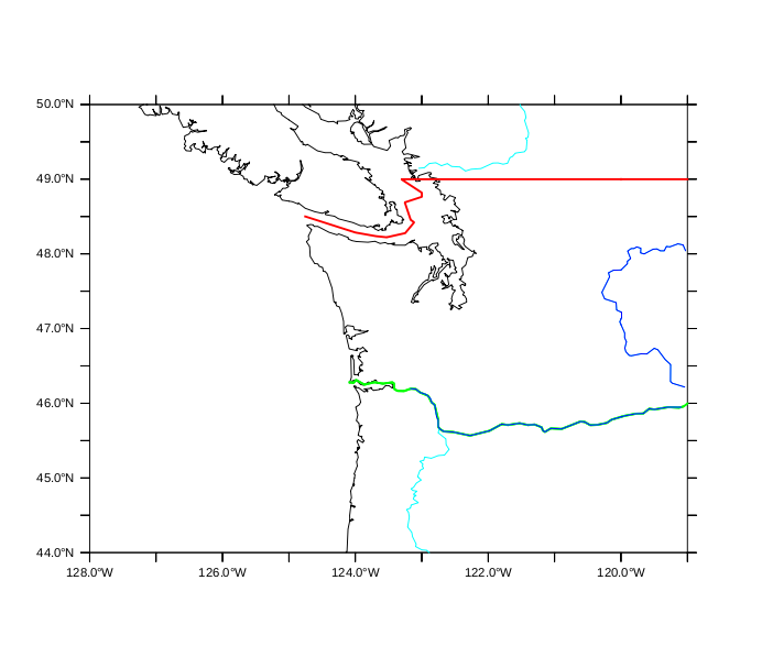 ! U.S. State boundaries are available in the North and South America. Here we use pen-color codes 8 and 9 for national and state boundaries in red and green, so that the rivers show up on top of the national or state boundary lines.