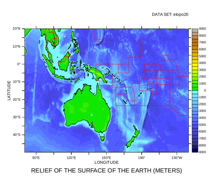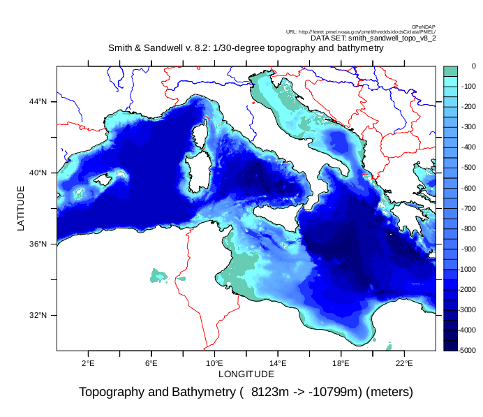 yes? use "https://data.pmel.noaa.gov/pmel/thredds/dodsC/data/PMEL/smith_sandwell_topo_v8_2.nc" yes? fill/lev=(-5000,-1000,500)(-1000,0,50)/pal=topo/x=0:24/y=30:46 rose yes? go land_detail black overlay red " " blue blue