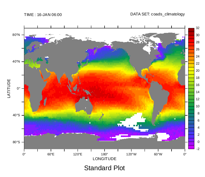 yes? USE coads_climatology yes? SHADE/X=0:360/Y=-90:90/L=1/TITLE="Standard Plot" sst yes? GO fland yes? GO land
