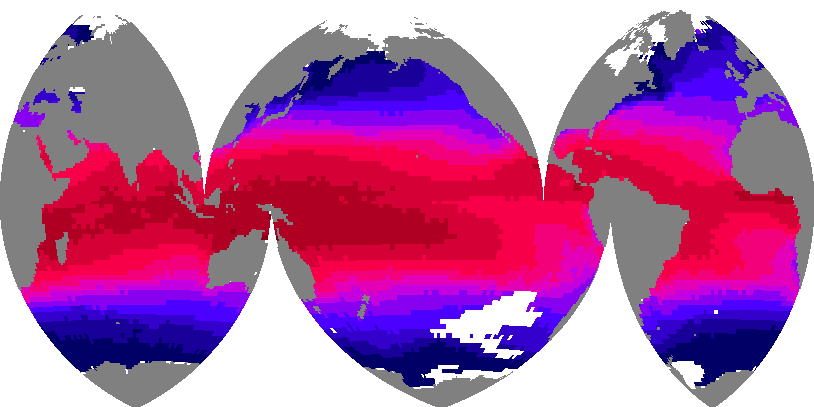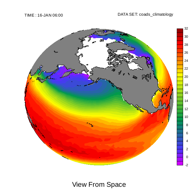 yes? USE coads_climatology yes? SET REGION/X=0:360/Y=-90:90/L=1 yes? GO mp_orthographic 210 45 yes? SET GRID sst yes? GO mp_aspect yes? LET masked_sst = sst * mp_mask yes? FILL/NOAX/NOLAB masked_sst, x_page, y_page yes? LABEL/NOUSER `($PPL$XLEN)*0.5`,-0.4,0,0,0.2 View From Space yes? GO mp_fland yes? GO mp_land