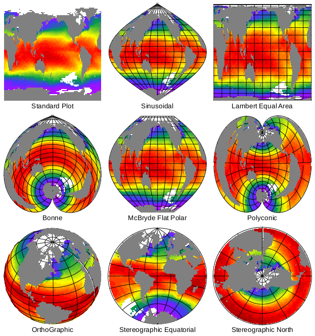 yes? set win/aspect=1:ax yes? define viewport/xlimits=0.000,0.333/ylim=0.666,0.999 tl yes? define viewport/xlimits=0.000,0.333/ylim=0.333,0.666 ml yes? define viewport/xlimits=0.000,0.333/ylim=0.000,0.333 bl yes? define viewport/xlimits=0.333,0.666/ylim=0.666,0.999 tm yes? define viewport/xlimits=0.333,0.666/ylim=0.333,0.666 mm yes? define viewport/xlimits=0.333,0.666/ylim=0.000,0.333 bm yes? define viewport/xlimits=0.666,0.999/ylim=0.666,0.999 tr yes? define viewport/xlimits=0.666,0.999/ylim=0.333,0.666 mr yes? define viewport/xlimits=0.666,0.999/ylim=0.000,0.333 br yes? set region/x=0:360/y=-90:90/l=1 yes? set view tl yes? go margins .2, .6, .2, .2 yes? shade/nolab/nokey/noaxes sst yes? go fland 120 gray yes? label/nouser `($PPL$XLEN)*0.5`,-0.4,0,0,.20 Standard Plot yes? set view tm yes? go mp_sinusoidal yes? go margins .2, .6, .2, .2 yes? shade/nolab/nokey/noaxes sst, x_page, y_page yes? go mp_graticule Replacing definition of axis LON_FIELD_I_AXIS Replacing definition of axis LON_FIELD_J_AXIS Replacing definition of axis LAT_FIELD_I_AXIS Replacing definition of axis LAT_FIELD_J_AXIS yes? go mp_fland 120 gray yes? label/nouser `($PPL$XLEN)*0.5`,-0.4,0,0,.20 Sinusoidal yes? set view tr yes? go mp_lambert_cyl yes? go margins .2, .6, .2, .2 yes? shade/nolab/nokey/noaxes sst, x_page, y_page yes? go mp_graticule yes? go mp_fland 120 gray yes? label/nouser `($PPL$XLEN)*0.5`,-0.4,0,0,.20 Lambert Equal Area yes? set view ml yes? go mp_bonne yes? go margins .2, .6, .2, .2 yes? shade/nolab/nokey/noaxes sst, x_page, y_page yes? go mp_graticule yes? go mp_fland 120 gray yes? label/nouser `($PPL$XLEN)*0.5`,-0.4,0,0,.20 Bonne yes? set view mm yes? go mp_mcbryde_fpp yes? go margins .2, .6, .2, .2 yes? shade/nolab/nokey/noaxes sst, x_page, y_page yes? go mp_graticule yes? go mp_fland 120 gray yes? label/nouser `($PPL$XLEN)*0.5`,-0.4,0,0,.20 McBryde Flat Polar yes? set view mr yes? go mp_polyconic yes? go margins .2, .6, .2, .2 yes? shade/nolab/nokey/noaxes sst, x_page, y_page yes? go mp_graticule yes? go mp_fland 120 gray yes? label/nouser `($PPL$XLEN)*0.5`,-0.4,0,0,.20 Polyconic yes? set view bl yes? go mp_orthographic 300 45 yes? go margins .2, .6, .2, .2 yes? let masked_sst = sst * mp_mask yes? shade/nolab/nokey/noaxes masked_sst, x_page, y_page yes? go mp_graticule yes? go mp_fland 120 gray yes? label/nouser `($PPL$XLEN)*0.5`,-0.4,0,0,.20 OrthoGraphic yes? set view bm yes? set region/x=240:420 yes? go mp_stereographic_eq yes? go margins .2, .6, .2, .2 yes? shade/nolab/nokey/noaxes sst, x_page, y_page yes? go mp_graticule 240 420 30 -90 90 15 Replacing definition of axis LON_FIELD_I_AXIS Replacing definition of axis LON_FIELD_J_AXIS Replacing definition of axis LAT_FIELD_I_AXIS Replacing definition of axis LAT_FIELD_J_AXIS yes? go mp_fland 120 gray yes? label/nouser `($PPL$XLEN)*0.5`,-0.4,0,0,.20 Stereographic Equatorial yes? set view br yes? set region/x=0:360/y=00:90 yes? go mp_stereographic_north yes? go margins .2, .6, .2, .2 yes? shade/nolab/nokey/noaxes sst, x_page, y_page yes? go mp_graticule 0 360 30 0 90 15 Replacing definition of axis LON_FIELD_I_AXIS Replacing definition of axis LON_FIELD_J_AXIS Replacing definition of axis LAT_FIELD_I_AXIS Replacing definition of axis LAT_FIELD_J_AXIS yes? go mp_fland 120 gray yes? label/nouser `($PPL$XLEN)*0.5`,-0.4,0,0,.20 Stereographic North