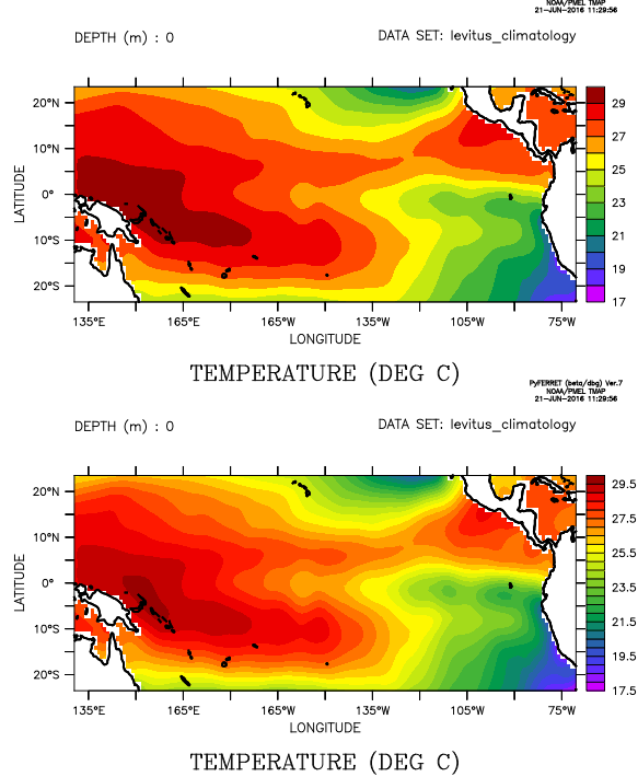 yes? PALETTE ocean_temp yes? ppl list shaset RGB_MAPPING By_value SET POINT RED GREEN BLUE -2.0 80.0 0.0 100.0 100.0 0.0 30.0 20.0 100.0 100.0 10.0 0.0 60.0 30.0 100.0 20.0 100.0 100.0 0.0 100.0 30.0 100.0 0.0 0.0 100.0 35.0 60.0 0.0 0.0 100.0 yes? set view up; go magnify 1.2 yes? FILL/Z=0/title=" " temp; go land thick yes? set view mid; go magnify 1.2 yes? FILL/Z=50/title=" " temp; go land thick yes? set view low; go magnify 1.2 yes? FILL/Z=200 temp; go land thick