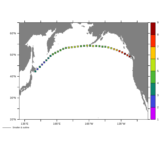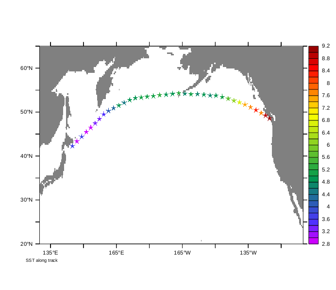 yes? ! Open demo ship track file with Lat, Lon, and SST yes? use polydata yes? ! polymark needs an underlying plot to define scaling yes? go basemap x=130:250 Y=20:65 20 yes? go polymark poly/over/key/title="SST along track" lon lat sst star