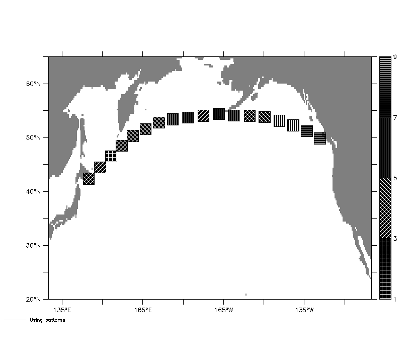 ! Use a square in a pattern & outline yes? go basemap x=130:250 Y=20:65 20 yes? go polymark poly/over/key/pattern=4patterns/palette=black/line/fill/lev=(1,9,2)/title="Using patterns" lon[i=3:37:2] lat[i=3:37:2] sst[i=3:37:2] square 1.75
