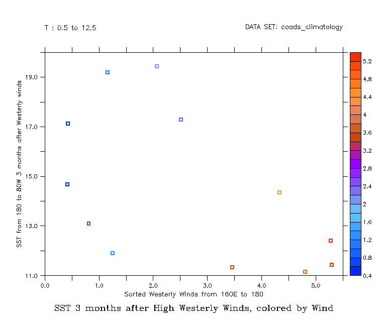 Now a more involved example: What is the Sea Surface Temperaturein a region three months after the strongest winds in anotherregion? Use the COADS monthly climatology data set. Choose a region in the Pacific, and define the westerly_wind variableto be the monthly west winds averaged over this region. Sort thewesterly winds, lowest to highest. "sorted_indices3"is the indices 3 months after.