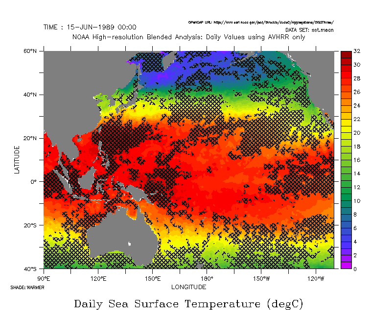 yes? let coads_on_reynolds = sst[d=1,g=sst[d=2]] yes? let warmer = IF sst[d=2] GT coads_on_reynolds THEN 1 yes? shade/over/pal=black/levels/pattern=weave/t="15-jun-1989" warmer