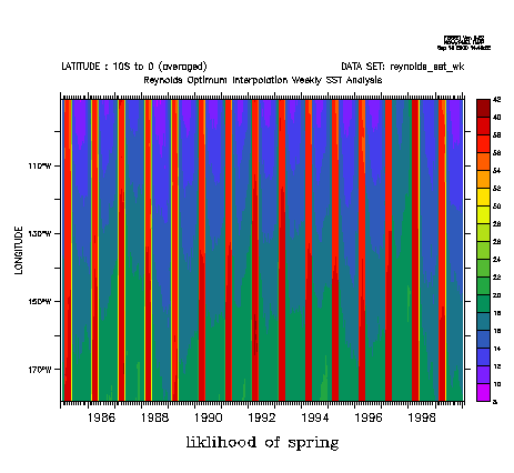 ! A journal script demonstrating one way to create ! a seasonal mask. ! ! First use ncdump to see what the units and T0 ! for the reynolds time axis are ! ! > ncdump -h reynolds_sst_wk.cdf ! ! REYNOLDS_T:units = "DAY since 0000-12-30 00:00:00" ; ! REYNOLDS_T:time_origin = "30-DEC-0000" ; ! ! Now create a variable that has values of day number ! but that is defined on a grid with the reynolds time axis. use reynolds_sst_wk let year_days = mod(t[gt=wsst],365.2425) ! Now create a mask which has a value of 1 only for days ! 60 to 151 (March to May). ! All other days will be flagged as missing values. let daily_mask_a = IF year_days gt 59 then 1 let daily_mask_b = IF year_days lt 152 then 1 let daily_mask = daily_mask_a * daily_mask_b ! Use one definition of springiness for the spring and ! another for the rest of the year. let spring = fsst + 10 let rest = fsst - 10 let/title="liklihood of spring" springiness = IF daily_mask THEN spring ELSE rest ! Set the desired region and plot the result set region/x=180:270/y=10s:0n/t=15-jan-1985:15-jan-2000 fill/transpose springiness[y=@ave]