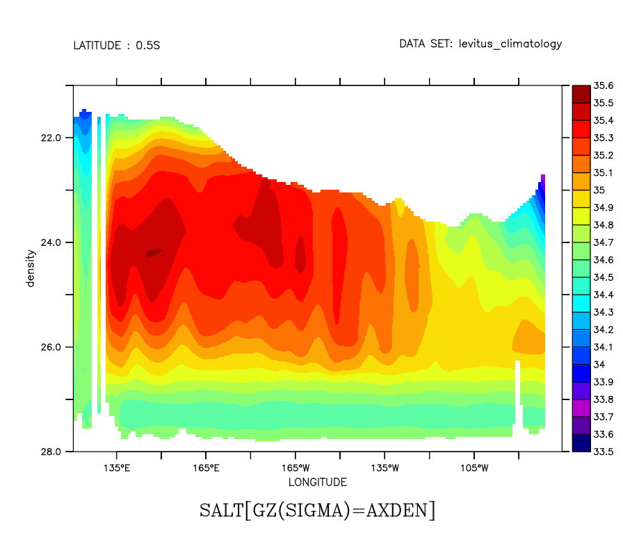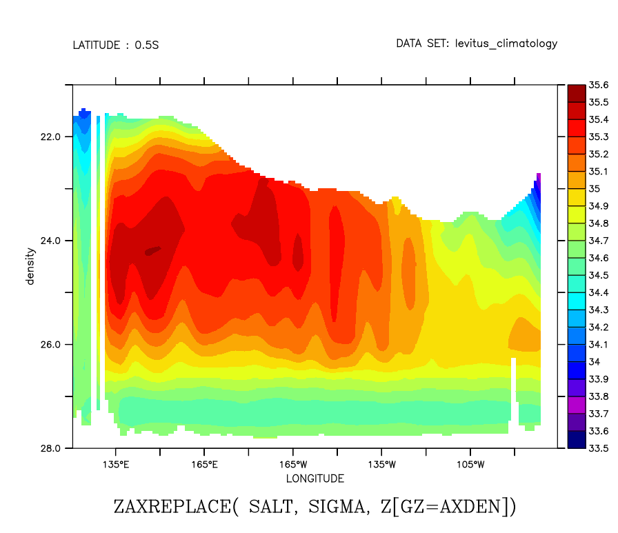 ! Define the density conversion, and apply a regridding operation yes? set dat levitus_climatology yes? let sigma=rho_un(salt,temp,0)-1000 yes? define axis/z=21:28:.05 axden ! Define the auxiliary regridding operation ! giving the new variable the title of the Salinity variable ! but units of density yes? LET/like=salt/units=density salt_on_density = salt[gz(sigma)=axden] ! Make Pacific plot, labeling the vertical axis as density. yes? fill/y=0/x=120e:75w/vlimits=28:21:-1 salt_on_density