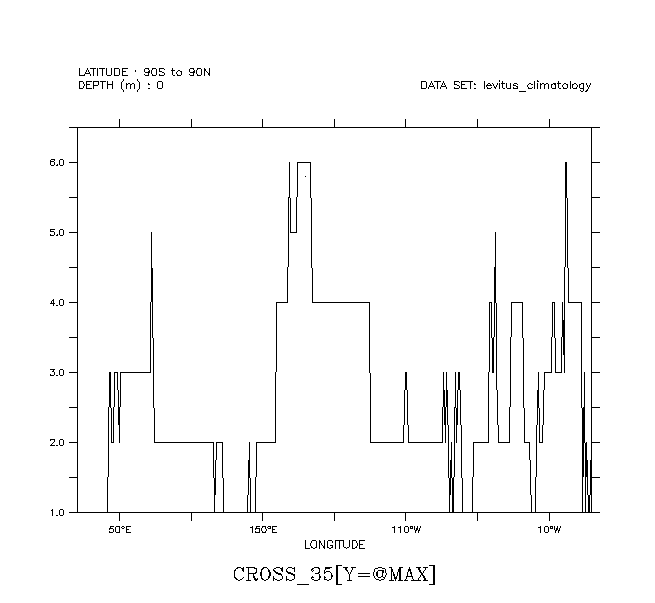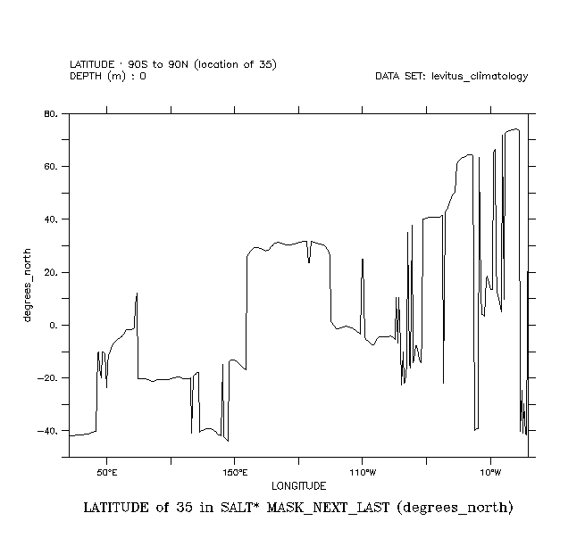! What we really want is the location of the southernmost shaded ! latitude at each longitude on the above plot. We might think ! to use @LOC:35 on the variable salt_mask, but that points to ! the next crossing of the value 35, and we are already at the ! last crossing. Let's make a new mask, the next-to-last crossing. yes? LET next_last = MAX(last_cross-1, 0) yes? LET mask_next_last = IF cross_35 GE next_last THEN 1 ! This masked variable contains all data up to the next-to-last ! crossing of the value 35. yes? LET salt_next_last = salt* mask_next_last ! Now @LOC:35 points to the last (northernmost) crossing of ! the value 35 within the data.