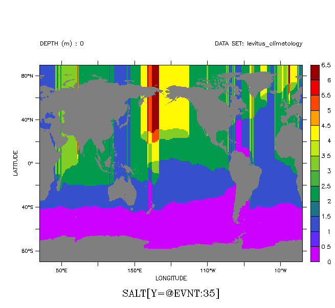 ! Get all the places where SALT crosses the value 35. ! At various longitudes, there are places where this does ! not happen at all; in other locations it crosses 35 ! once, twice, even 6 times. @EVNT is incremented each ! time the event occurs. yes? LET cross_35 = salt[Y=@EVNT:35] yes? SHADE cross_35; go fland 20
