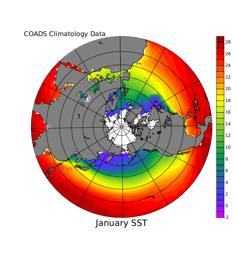 SET WIN/SIZ=0.6 PPL dfltfnt CR USE coads_climatology SET grid sst ! Define a region in the northern hemisphere. SET REGION/X=0:360/Y=11:90/L=1 ! Set up the map projection parameters and apply the ! correct aspect ratio. GO mp_stereographic_north 180 50 GO mp_aspect LET masked_sst = sst * mp_mask ! Plot the data, add land mask and land outline FILL/NOAXES/NOLAB masked_sst, x_page, y_page GO mp_fland 20 GO mp_land ! Mark latitude and longitude with a graticule. GO mp_graticule ! Add labels in world coordinates. go mp_label 10 10 1 0 .15 "COADS Climatology Data" go mp_label 180 6 0 0 0.2 "January SST"